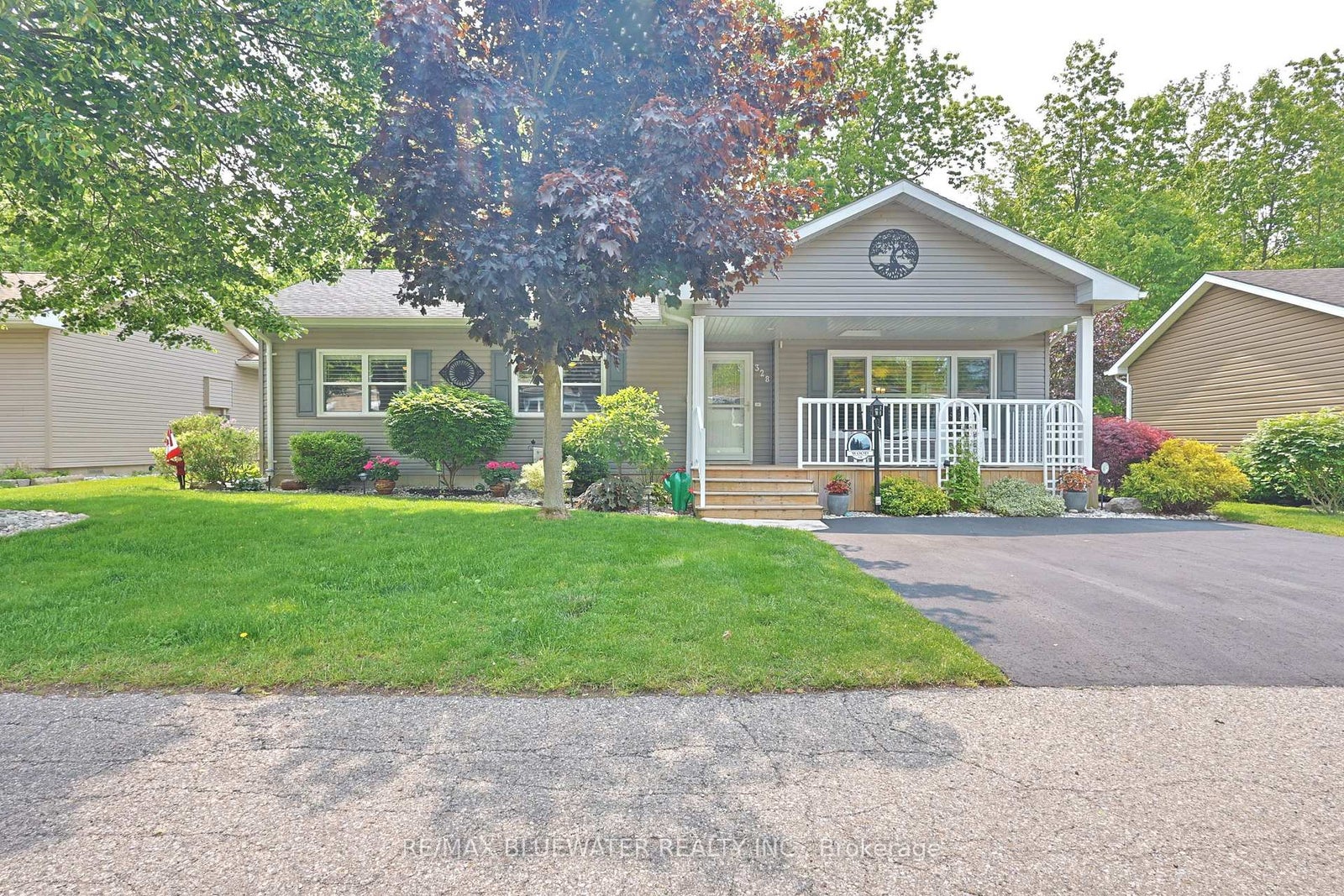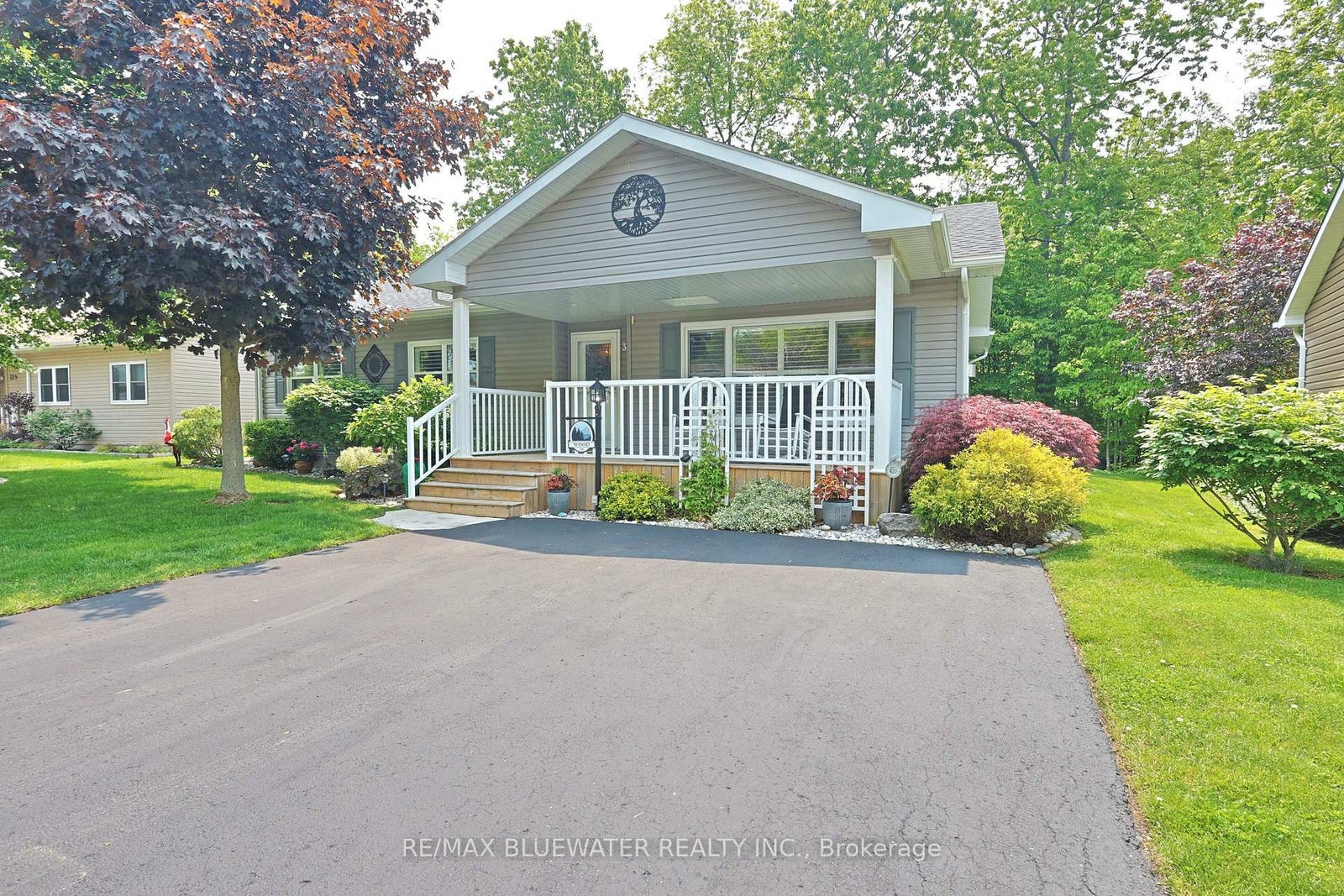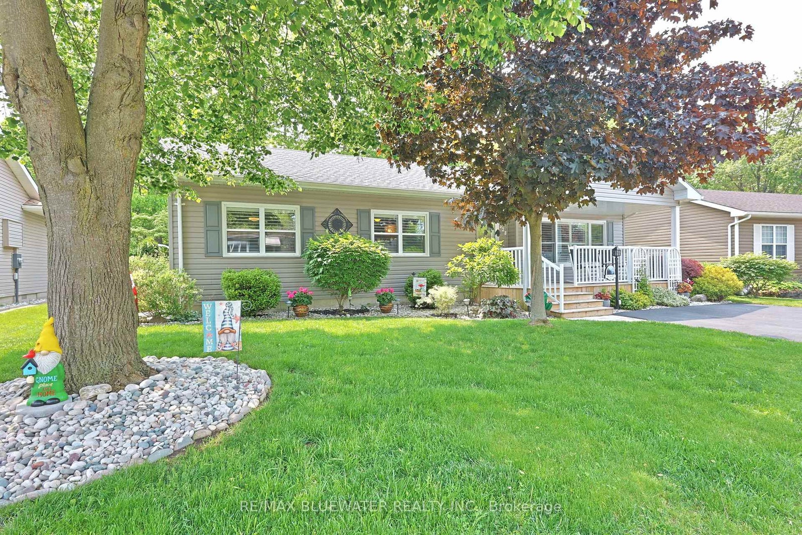 Nicely updated site built bungalow backing onto nature in the land leased community of Grand Cove. This home boasts great curb appeal with the covered front porch entrance, landscaped gardens that surround the home, updated vinyl siding and pitched roof line making it feel like home the moment you drive up the quiet street. Inside you have the popular Newcastle II floor plan featuring an open concept design with large principle rooms flowing with natural light. Large U shaped kitchen updated in 2019 with white shaker cabinetry all fitted with pull out drawers, granite countertops and tile backsplash. Dining room off the kitchen with extra window for more natural light. Spacious living room with gas fireplace on an accent wall surround, overmount lighting above and oversized picture window. At the back of the home you have an added on family room with a wall of windows overlooking nature leading to a 3 season sunroom with built in cabinetry for storage and walk out entrance door to the back deck. The quality of this home shows throughout with engineered hardwood flooring throughout the main living space and California blinds on almost every window. Main floor primary bedroom suite with walk in closet and updated ensuite bath that includes a large walk in shower and stacking laundry. Guest bedroom and updated main floor bathroom complete the inside of the home plus allow friends and family to visit. Updated furnace and AC in 2021, redesigned roof line in 2016, updated windows and plug in generator ready. The back yard is your own private oasis backing onto nature and a mature treed setting. Spacious back patio with covered eating area and gazebo to enjoy your afternoon conversations. Grand Cove Estates is a land lease community located in the heart of Grand Bend with activities for everybody from the heated saltwater pool, tennis courts, lawn bowling, dog park and so much more. All this and you are only a short walk to downtown and the sandy beaches of Lake Huron.