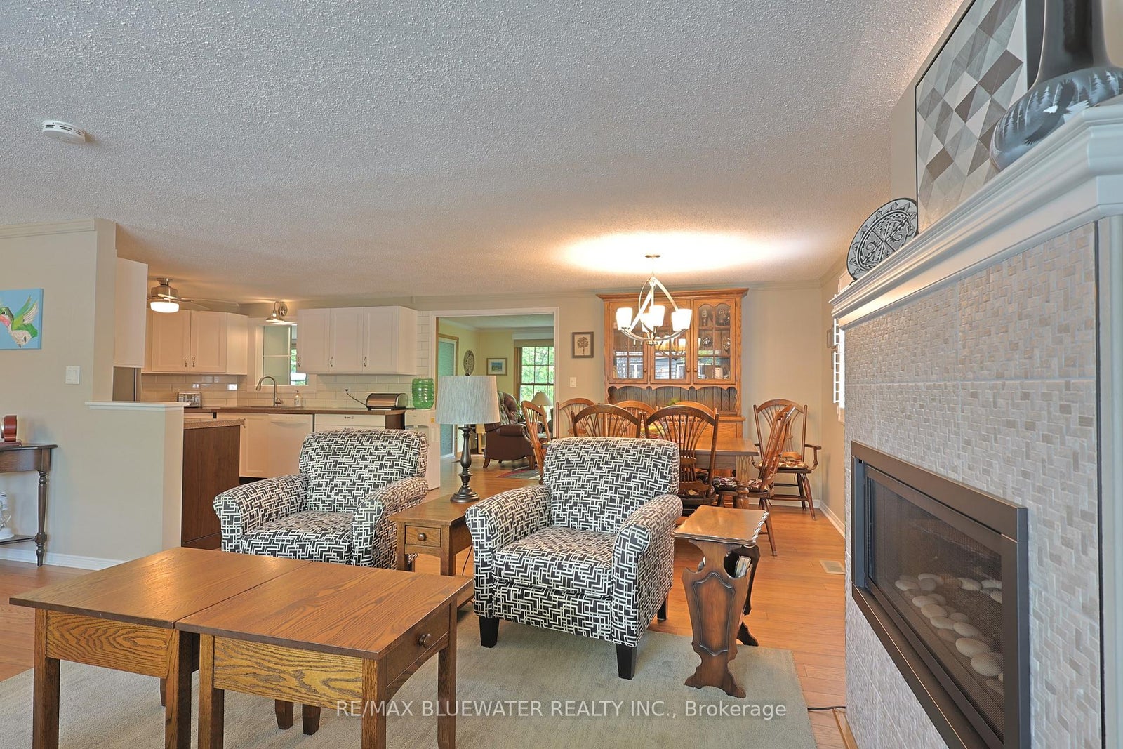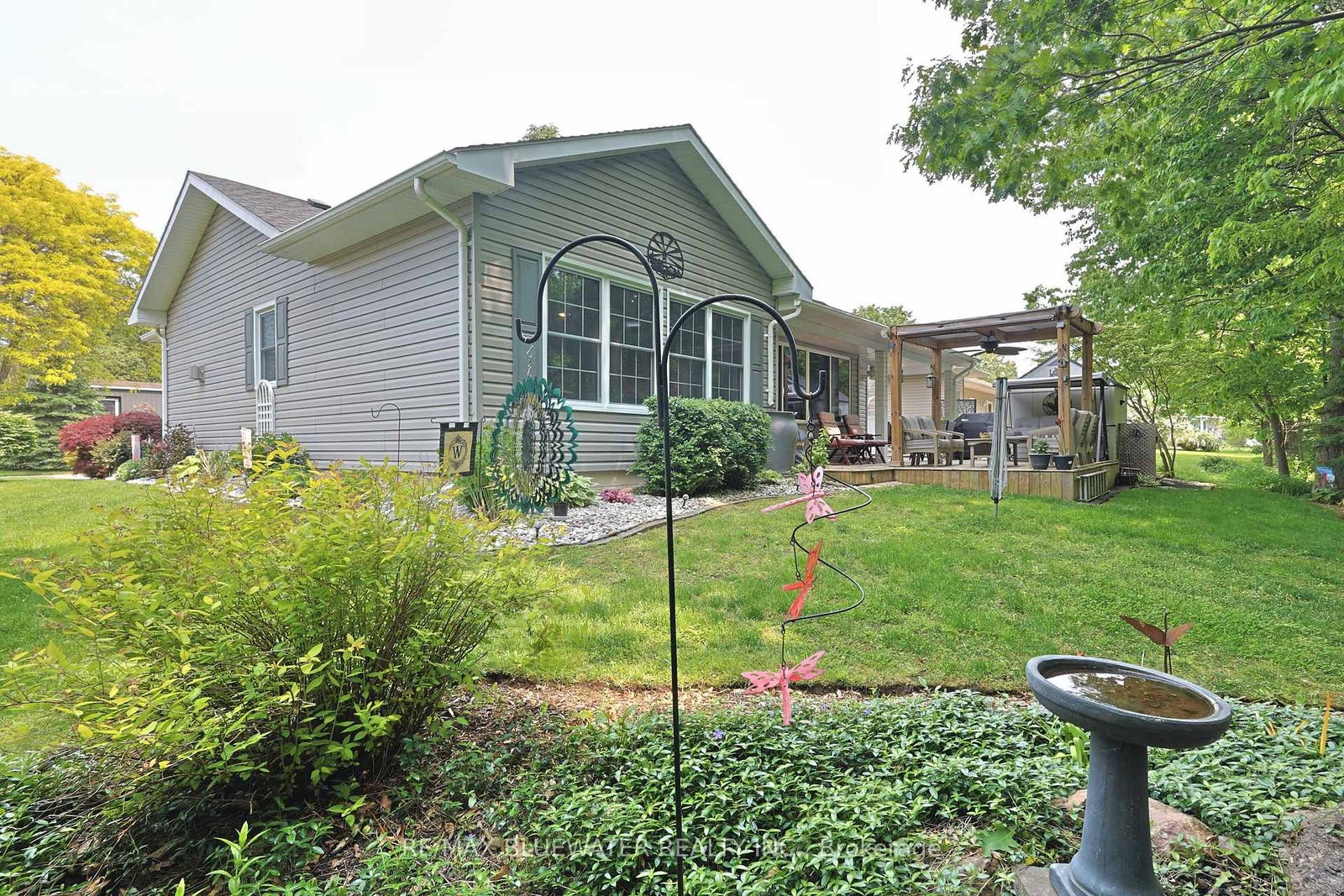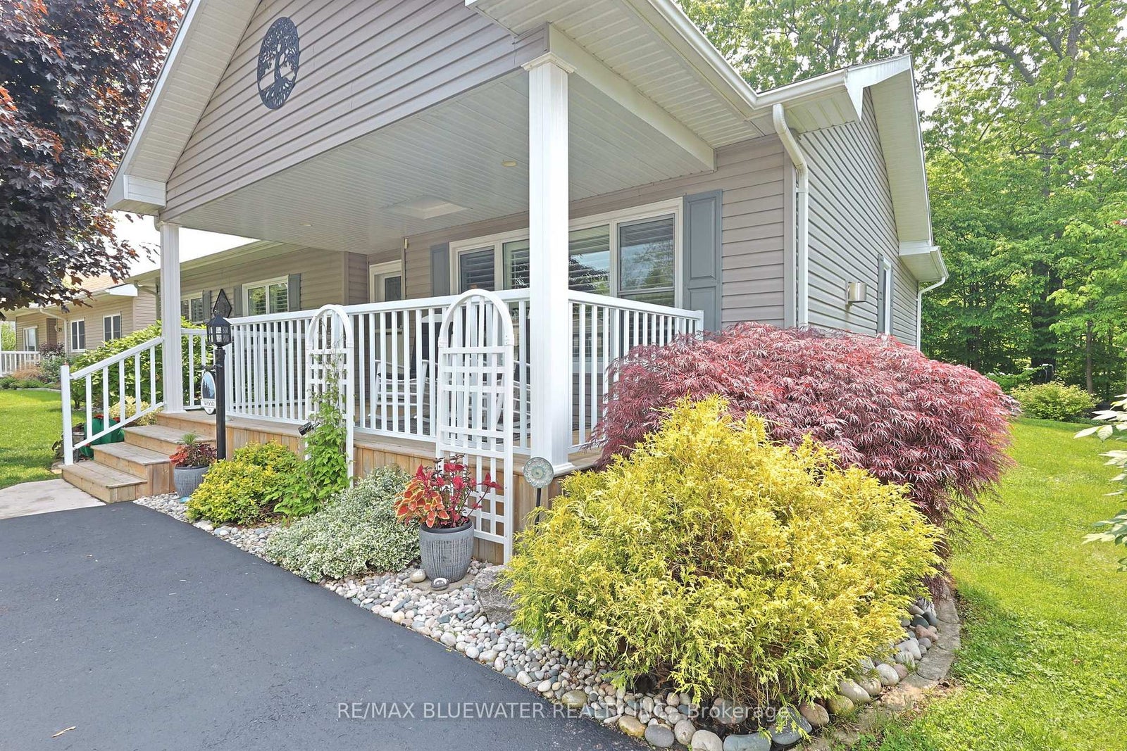 Nicely updated site built bungalow backing onto nature in the land leased community of Grand Cove. This home boasts great curb appeal with the covered front porch entrance, landscaped gardens that surround the home, updated vinyl siding and pitched roof line making it feel like home the moment you drive up the quiet street. Inside you have the popular Newcastle II floor plan featuring an open concept design with large principle rooms flowing with natural light. Large U shaped kitchen updated in 2019 with white shaker cabinetry all fitted with pull out drawers, granite countertops and tile backsplash. Dining room off the kitchen with extra window for more natural light. Spacious living room with gas fireplace on an accent wall surround, overmount lighting above and oversized picture window. At the back of the home you have an added on family room with a wall of windows overlooking nature leading to a 3 season sunroom with built in cabinetry for storage and walk out entrance door to the back deck. The quality of this home shows throughout with engineered hardwood flooring throughout the main living space and California blinds on almost every window. Main floor primary bedroom suite with walk in closet and updated ensuite bath that includes a large walk in shower and stacking laundry. Guest bedroom and updated main floor bathroom complete the inside of the home plus allow friends and family to visit. Updated furnace and AC in 2021, redesigned roof line in 2016, updated windows and plug in generator ready. The back yard is your own private oasis backing onto nature and a mature treed setting. Spacious back patio with covered eating area and gazebo to enjoy your afternoon conversations. Grand Cove Estates is a land lease community located in the heart of Grand Bend with activities for everybody from the heated saltwater pool, tennis courts, lawn bowling, dog park and so much more. All this and you are only a short walk to downtown and the sandy beaches of Lake Huron.