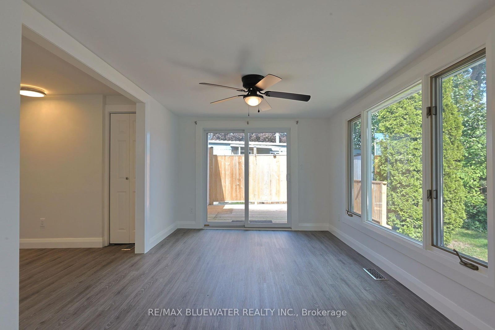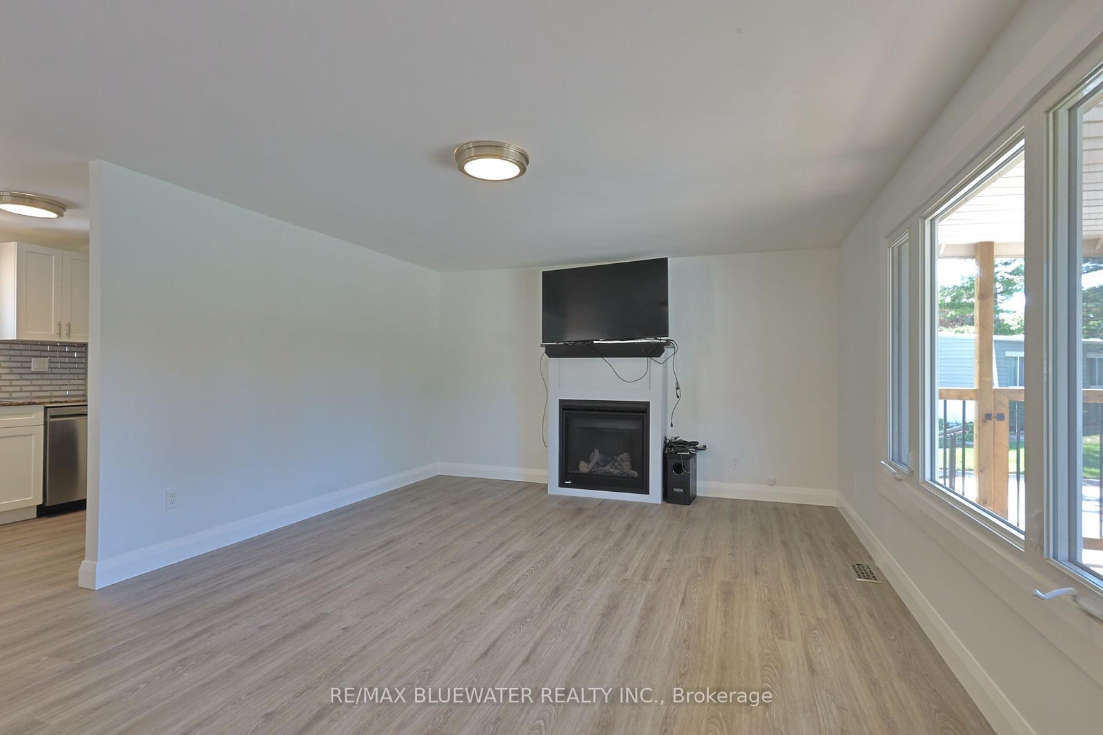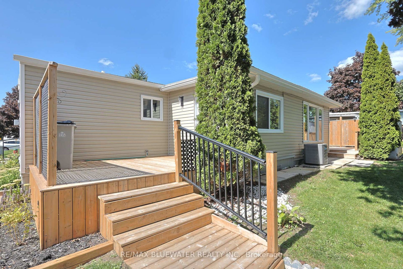 Welcome to 34 Pebble Beach Parkway where you will find a fully updated in 2022 interior and exterior home waiting for its new owners to enjoy! Great curb appeal with vinyl siding, vinyl windows, metal roof and front covered porch. Nicely updated interior with drywall throughout, fresh coat of paint, vinyl flooring throughout and lots of windows of windows for natural light. This floorplan with two BONUS rooms allows for a total of 1,296 square feet. The spacious entrance foyer with double closets heads into the den area with sliding doors to back deck. Open concept floorplan with large dining area, kitchen and living room. Kitchen has been totally updated with new cupboards, granite counters, tiled backsplash and stainless steel appliances. Living room with gas fireplace and TV with surround system that is included. Primary bedroom with walk through closet and two piece ensuite. Home allows for a spacious full bathroom with glass tiled shower and a second guest bedroom. Home is outfitted with an on demand GENERAC Generator so you are never left in the dark! Grand Cove Estates is a 55+ land lease community located in the heart of Grand Bend. Grand Cove has activities for everybody from the heated saltwater pool, tennis courts, woodworking shop, garden plots, lawn bowling, dog park, green space, nature trails and so much more. All this and you are only a short walk to downtown Grand Bend and the sandy beaches of Lake Huron with the world-famous sunsets. Monthly land lease fee of $922.72 includes land lease, access to all amenities and taxes.